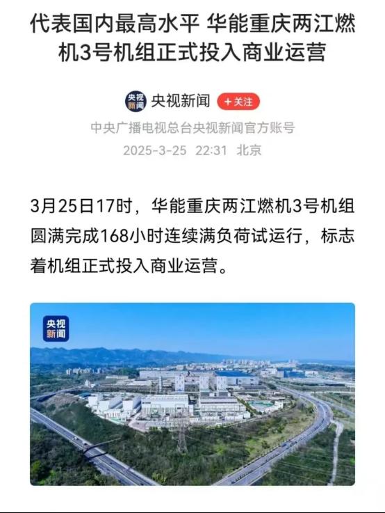 代表国内最高水平 华能重庆两江燃机3号机组正式投入商业运营